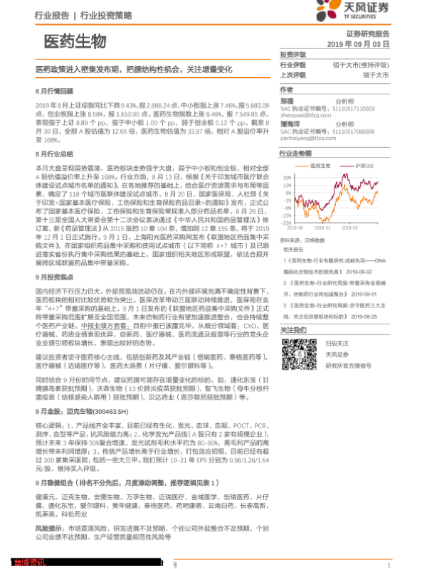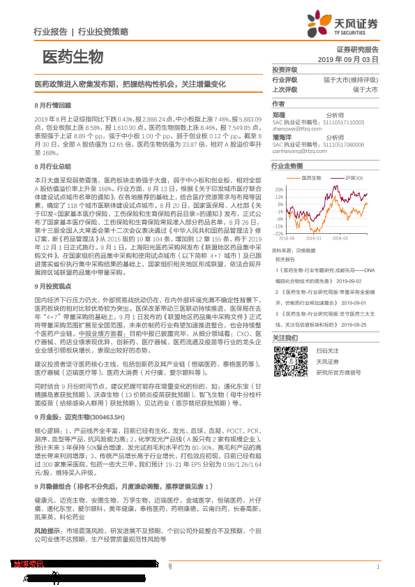 【天风证券】【20190903】医药生物行业投资策略:医药政策进入密集发布期,把握结构性机会,关注增量变化-24页