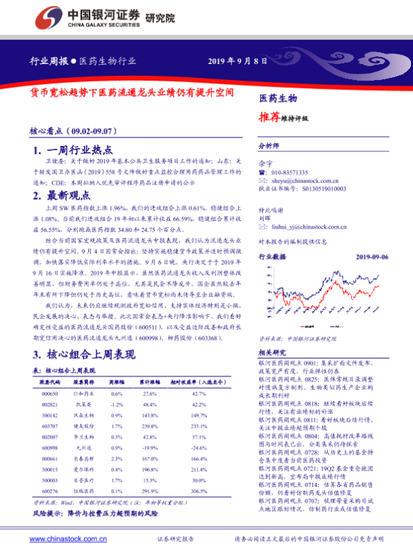 【银河证券】【20190908】医药生物行业周报:货币宽松趋势下医药流通龙头业绩仍有提升空间-30页