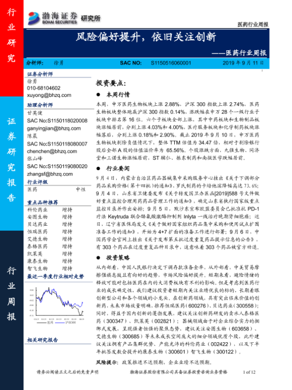 【渤海证券】【20190911】医药行业周报:风险偏好提升,依旧关注创新-12页