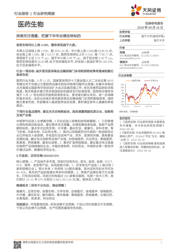 【天风证券】【20190915】医药生物行业研究周报:持续关注增量,把握下半年业绩反转标的-10页