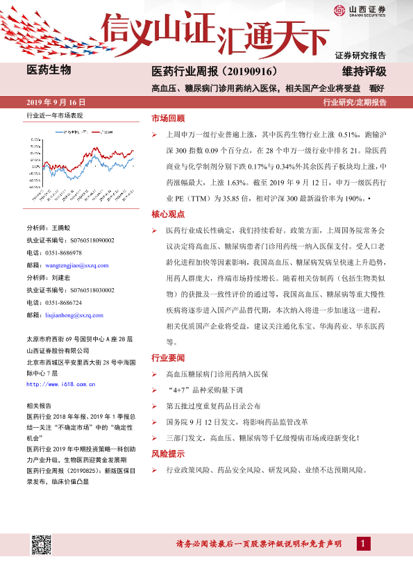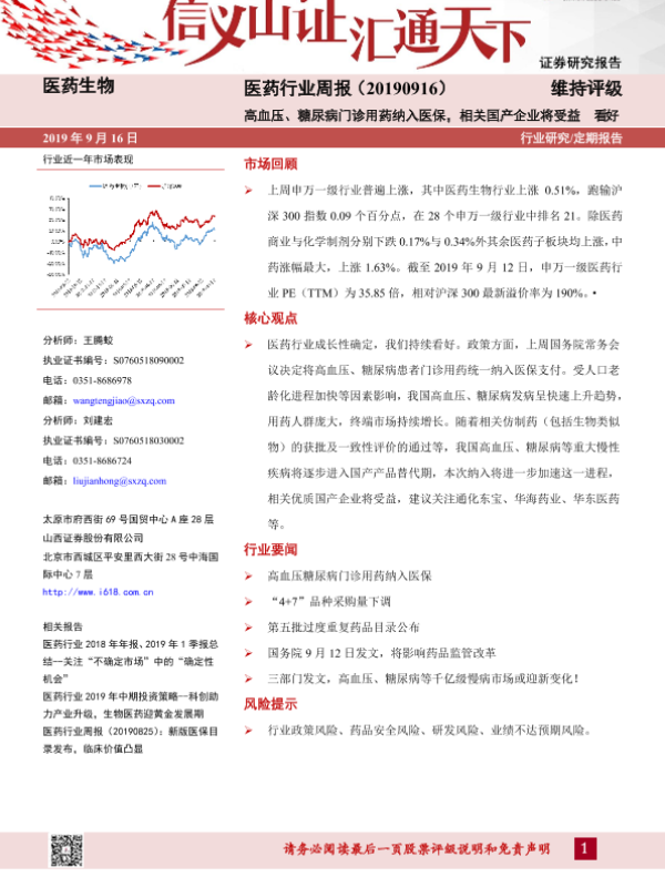 【山西证券】【20190916】医药行业周报:高血压、糖尿病门诊用药纳入医保,相关国产企业将受益-8页