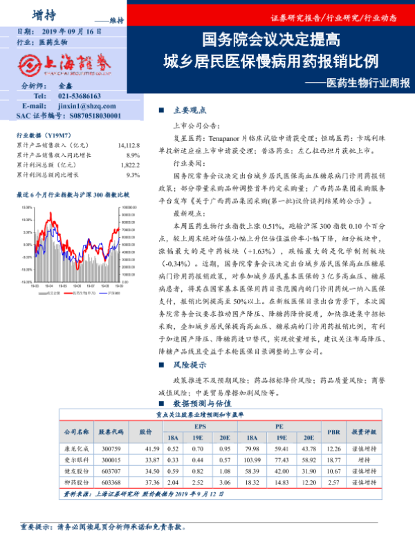 【上海证券】【20190916】医药生物行业周报:国务院会议决定提高城乡居民医保慢病用药报销比例-11页