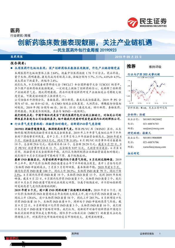 【民生证券】【20190923】医药外包行业周报:创新药临床数据表现靓丽,关注产业链机遇-15页