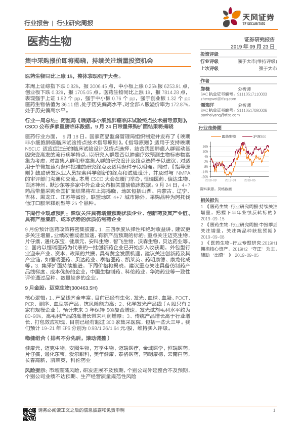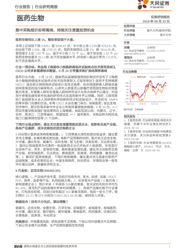 【天风证券】【20190923】医药生物行业研究周报:集中采购报价即将揭晓,持续关注增量投资机会-14页