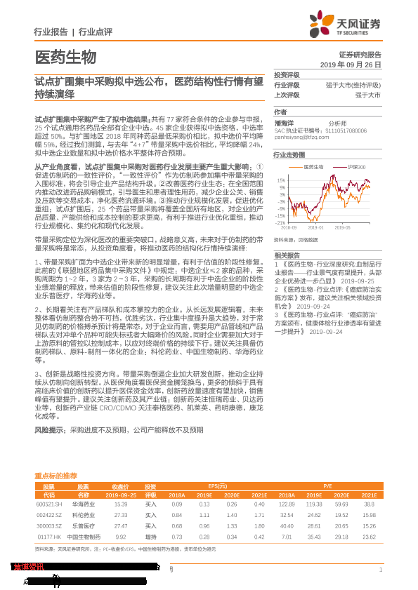 【天风证券】【20190926】医药生物行业点评:试点扩围集中采购拟中选公布,医药结构性行情有望持续演绎-2页