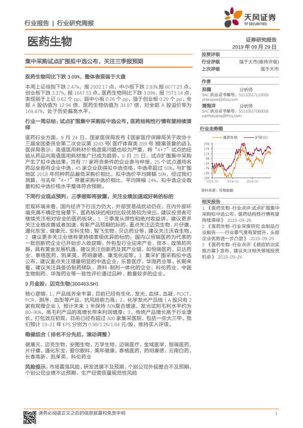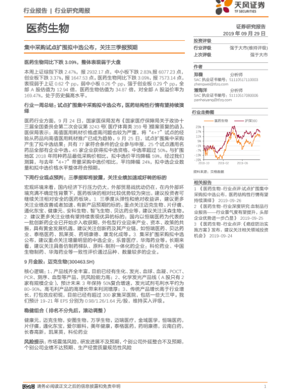 【天风证券】【20190929】医药生物行业研究周报:集中采购试点扩围拟中选公布,关注三季报预期-17页