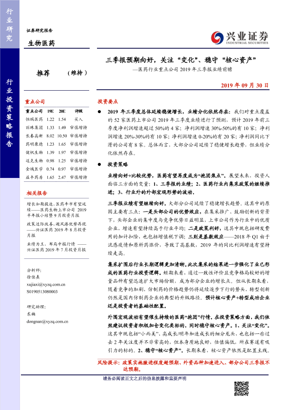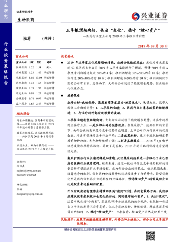三季报 业绩预测 医药行业 投资策略 核心资产