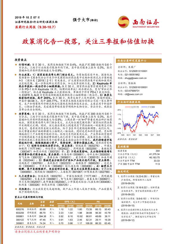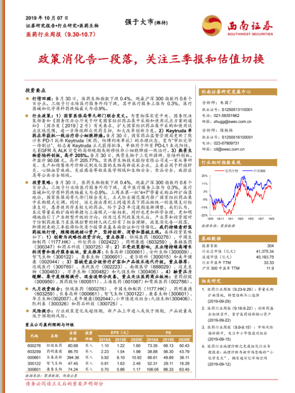 【西南证券】【20191007】医药行业周报:政策消化告一段落,关注三季报和估值切换-15页