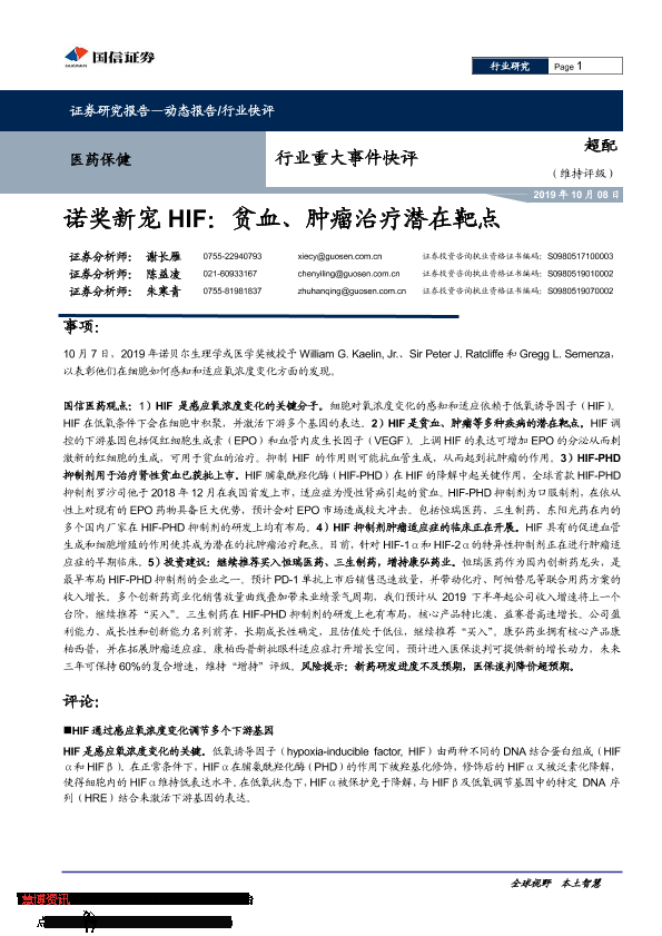 【国信证券】【20191008】诺奖新宠HIF:贫血、肿瘤治疗潜在靶点-6页