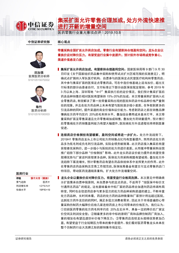 【中信证券】【20191008】医药零售行业重大事项点评:集采扩面允许零售合理加成,处方外流快速推进打开新的增量空间-3页