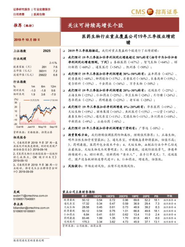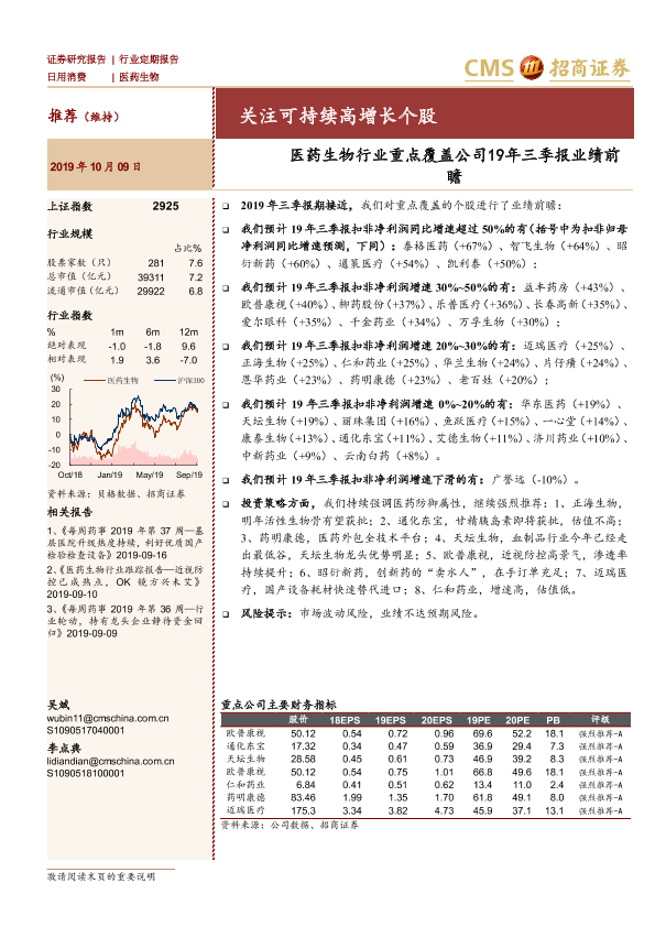 【海通证券】【20191009】医药生物行业重点覆盖公司19年三季报业绩前瞻:关注可持续高增长个股-3页