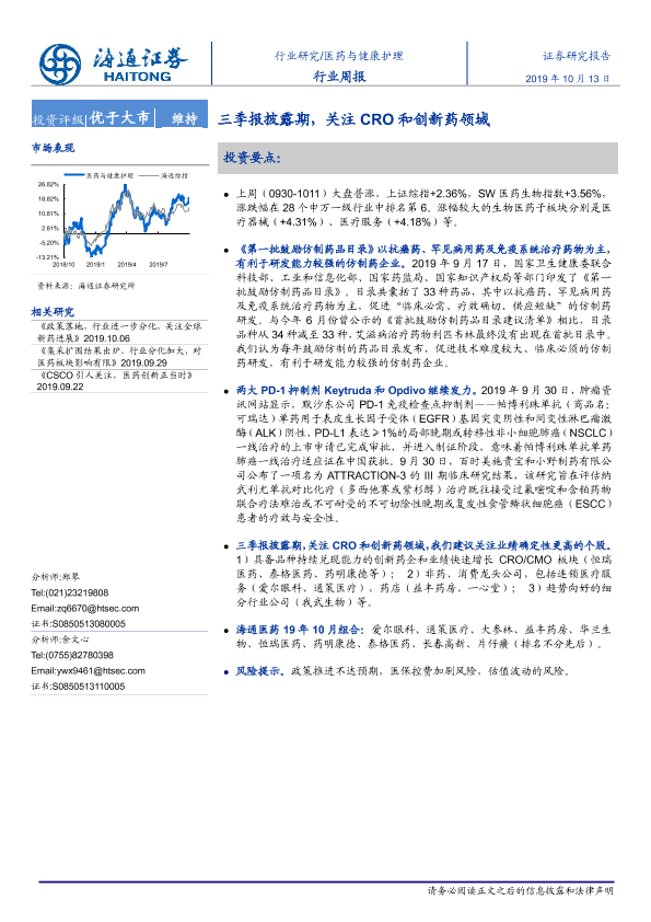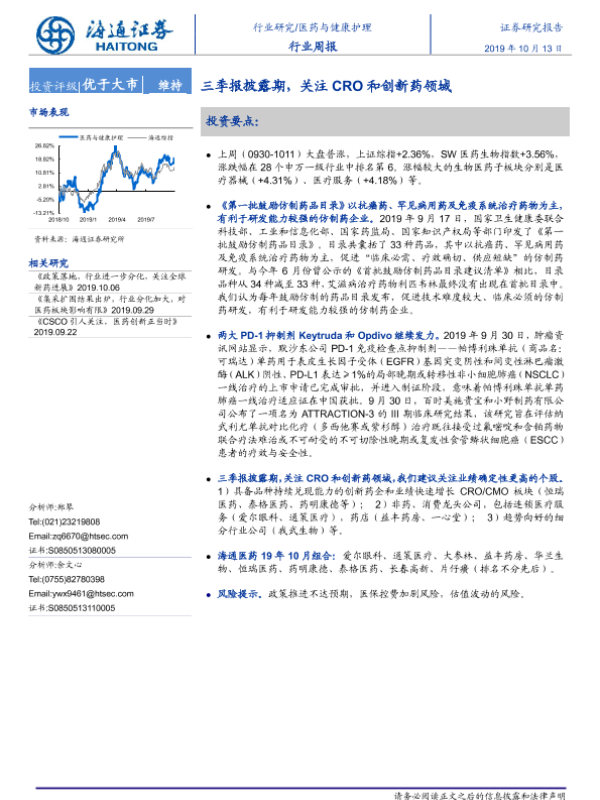 【海通证券】【20191013】医药与健康护理行业周报:三季报披露期,关注CRO和创新药领域-8页
