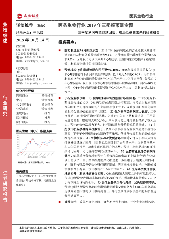 【东莞证券】【20191014】医药生物行业2019年三季报预测专题:三季度利润有望继续回暖,布局低基数带来的投资机会-16页