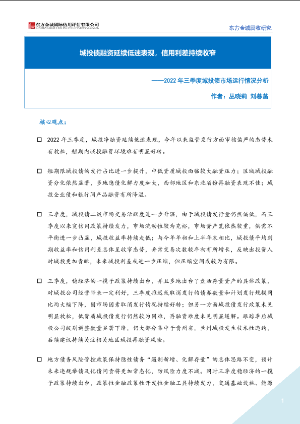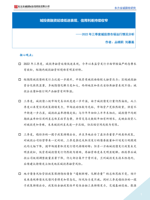 【东方金诚】【20220930】2022年三季度城投债市场运行情况分析报告-11页