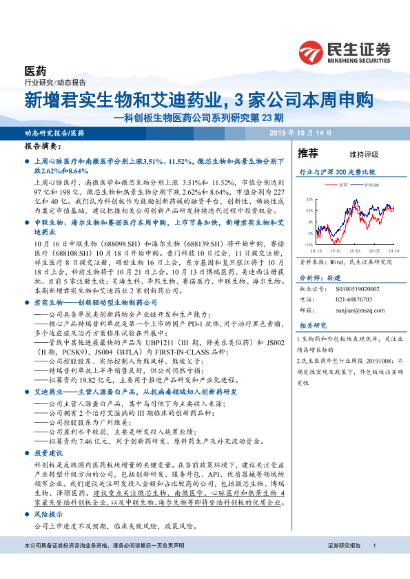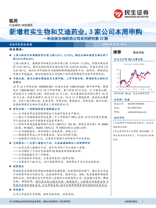 【民生证券】【20191014】新增君实生物和艾迪药业,3家公司本周申购-16页