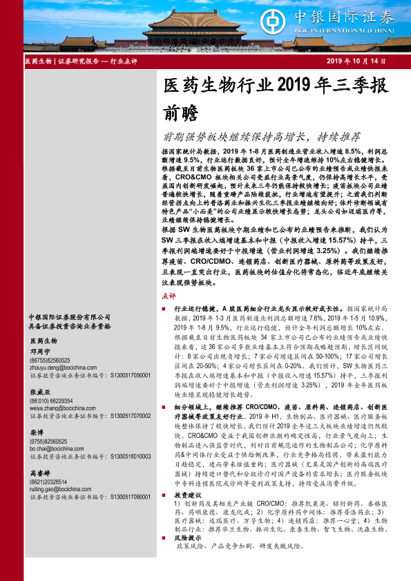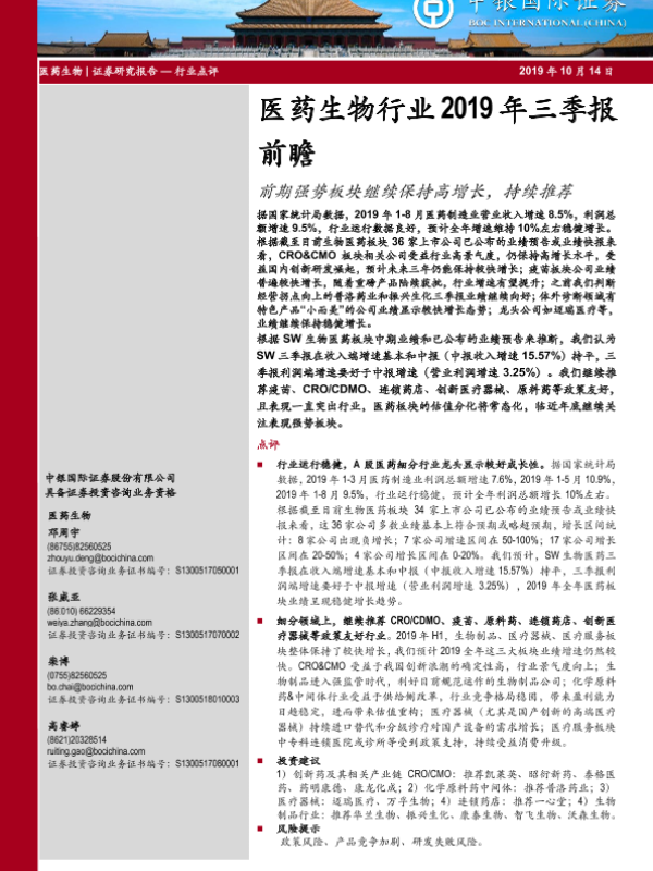 【中银证券】【20191014】医药生物行业2019年三季报前瞻:前期强势板块继续保持高增长,持续推荐-4页