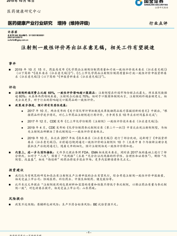 【国金证券】【20191016】注射剂一致性评价再出征求意见稿,相关工作有望提速-5页