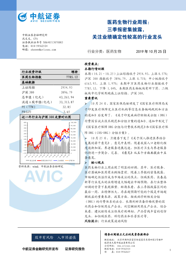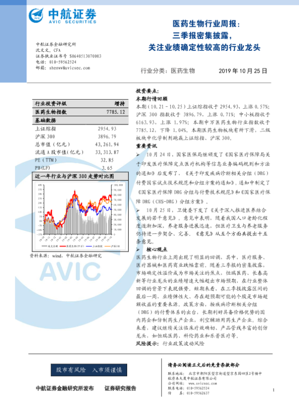 【中航证券】【20191025】医药生物行业周报:三季报密集披露,关注业绩确定性较高的行业龙头-6页