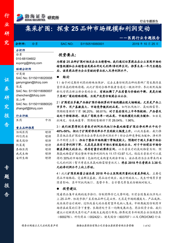 【渤海证券】【20191025】集采扩围:探索25品种市场规模和利润变动-62页