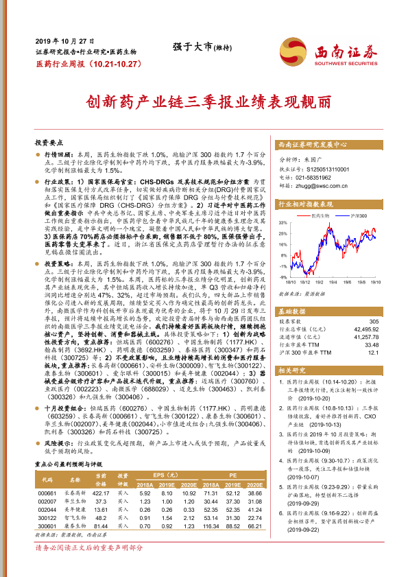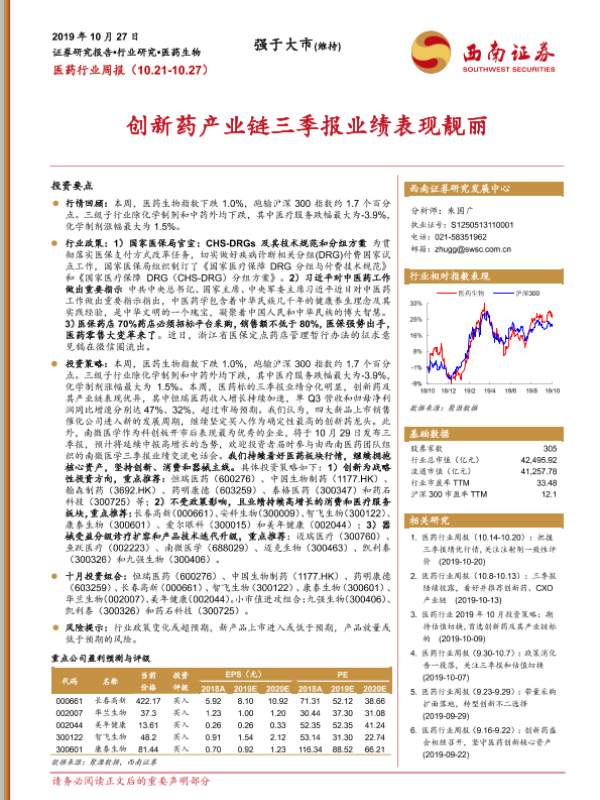 【西南证券】【20191027】医药行业周报:创新药产业链三季报业绩表现靓丽-15页