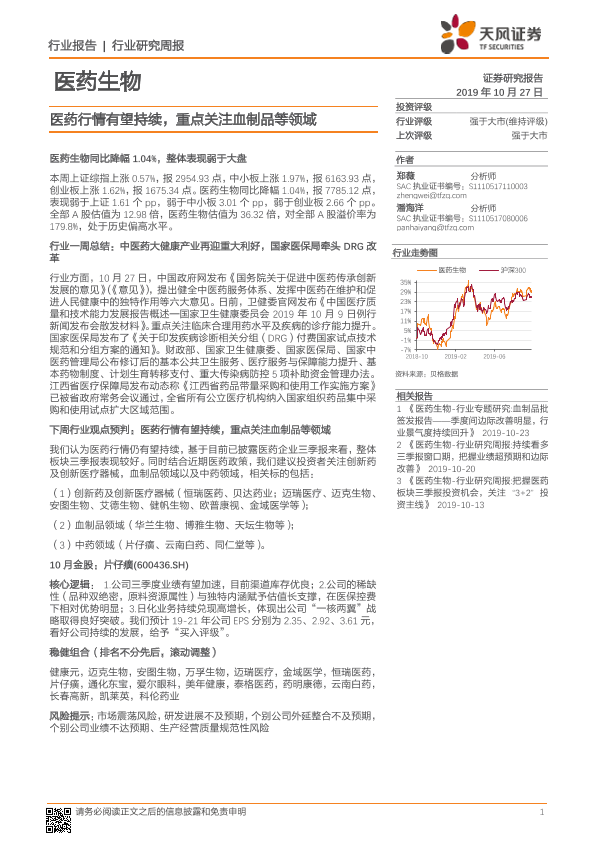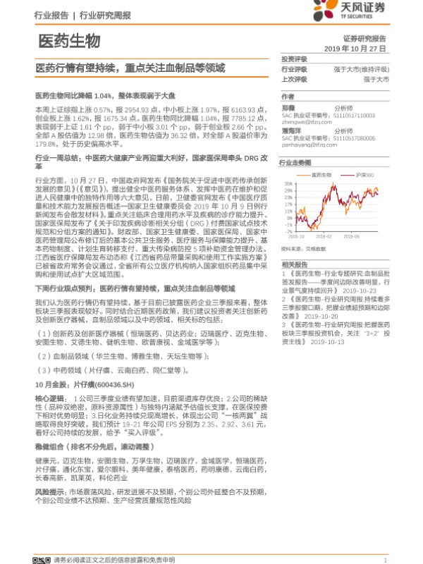 【天风证券】【20191027】医药生物行业研究周报:医药行情有望持续,重点关注血制品等领域-13页