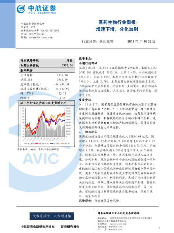 【中航证券】【20191102】医药生物行业周报:增速下滑,分化加剧-6页