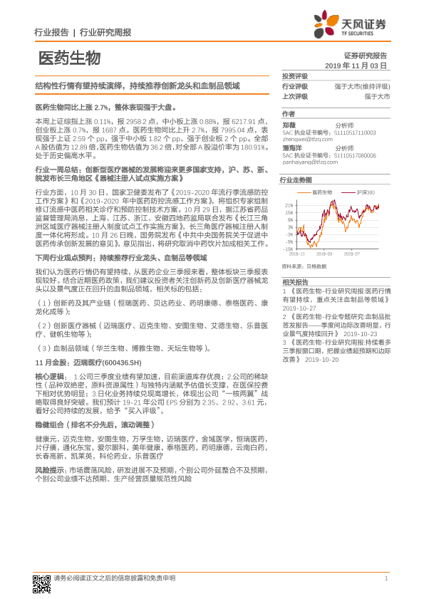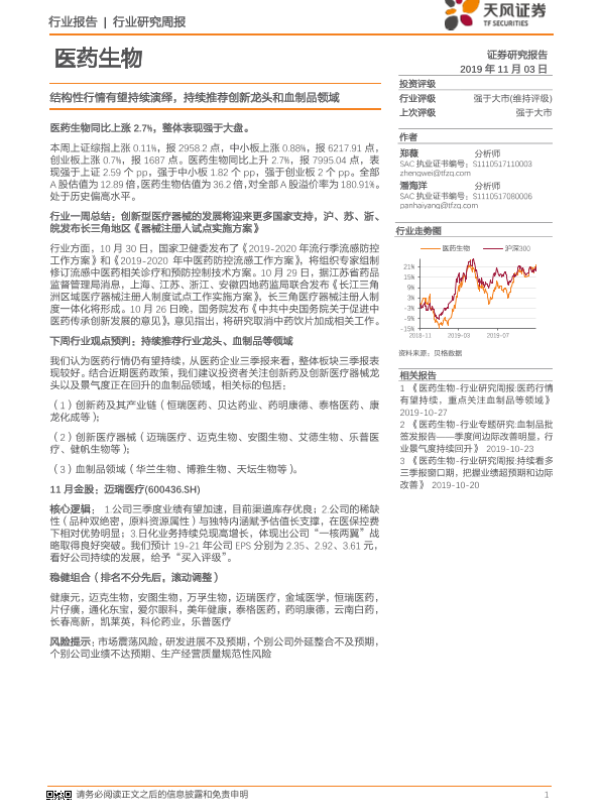 【天风证券】【20191103】医药生物行业研究周报:结构性行情有望持续演绎,持续推荐创新龙头和血制品领域-13页
