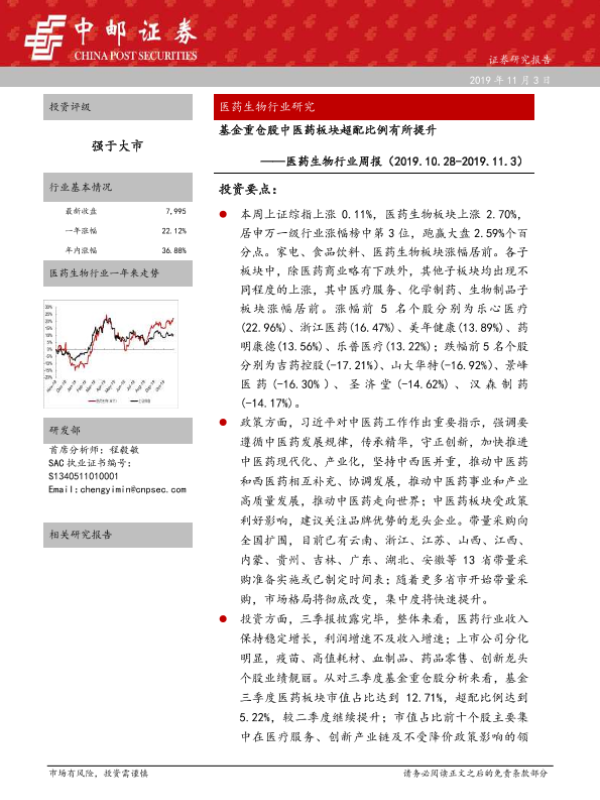 【中邮证券】【20191103】医药生物行业周报:基金重仓股中医药板块超配比例有所提升-14页