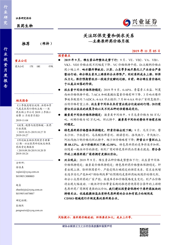 【兴业证券】【20191105】主要原料药价格月报:关注环保变量和供求关系-40页