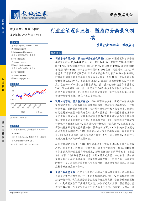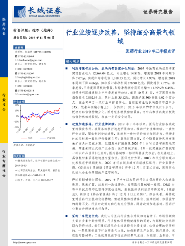 【长城证券】【20191106】医药行业2019年三季报点评:行业业绩逐步改善,坚持细分高景气领域-22页