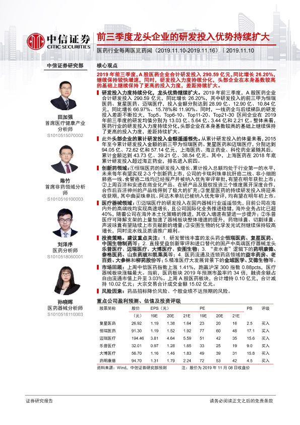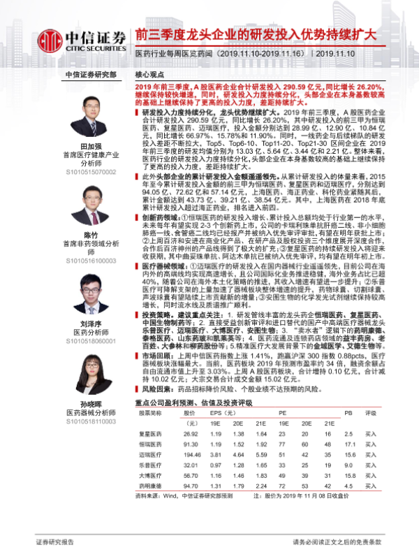 【中信证券】【20191110】医药行业每周医览药闻:前三季度龙头企业的研发投入优势持续扩大-16页