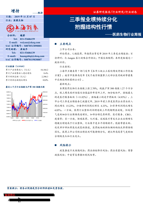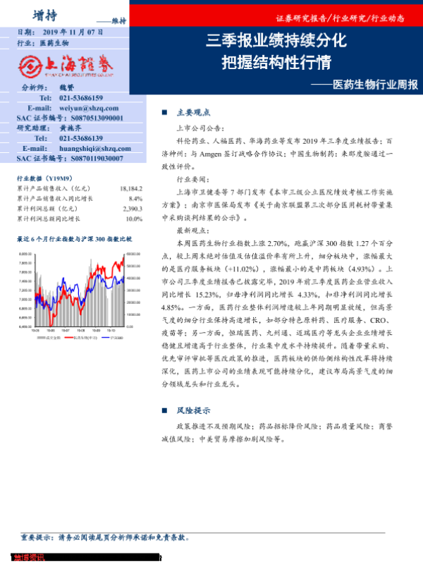 【上海证券】【20191107】医药生物行业周报:三季报业绩持续分化 把握结构性行情-12页