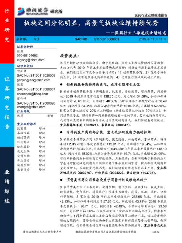 【渤海证券】【20191111】医药行业三季度报业绩综述:板块之间分化明显,高景气板块业绩持续优秀-22页