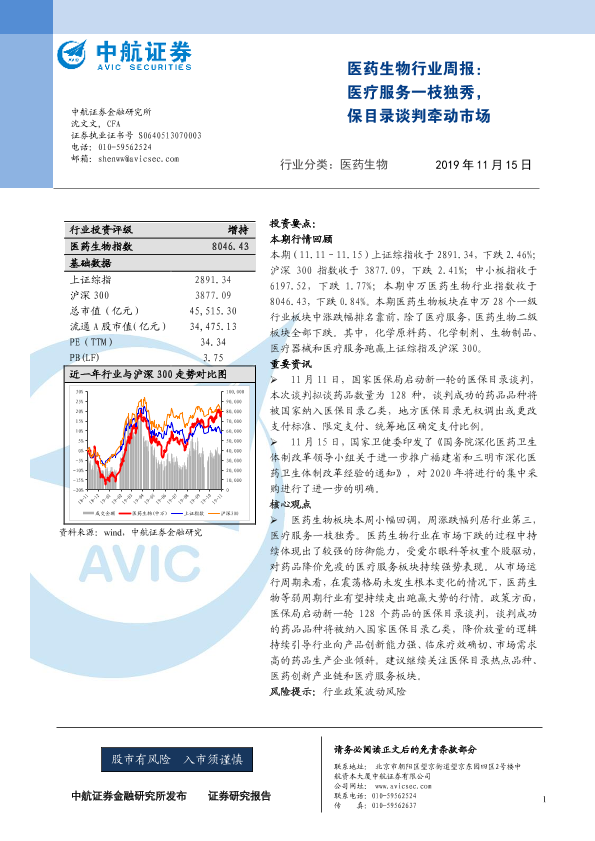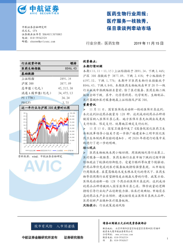 【中航证券】【20191115】医药生物行业周报:医疗服务一枝独秀,保目录谈判牵动市场-6页
