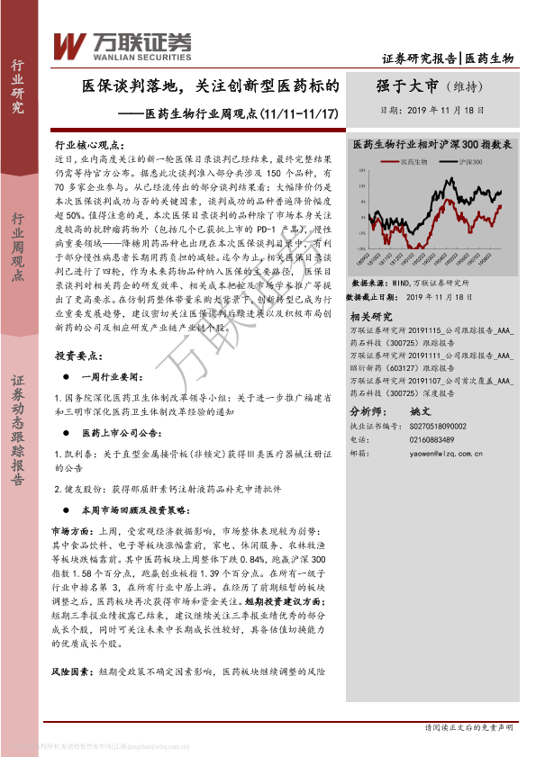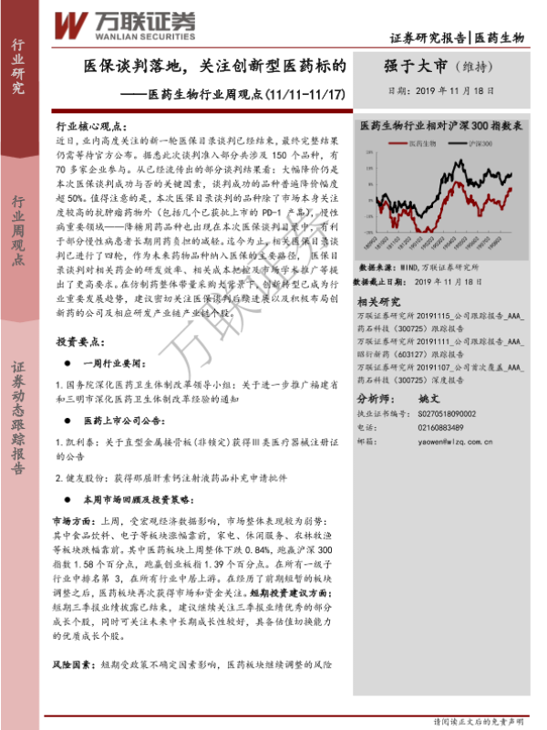 【万联证券】【20191118】医药生物行业周观点:医保谈判落地,关注创新型医药标的-9页