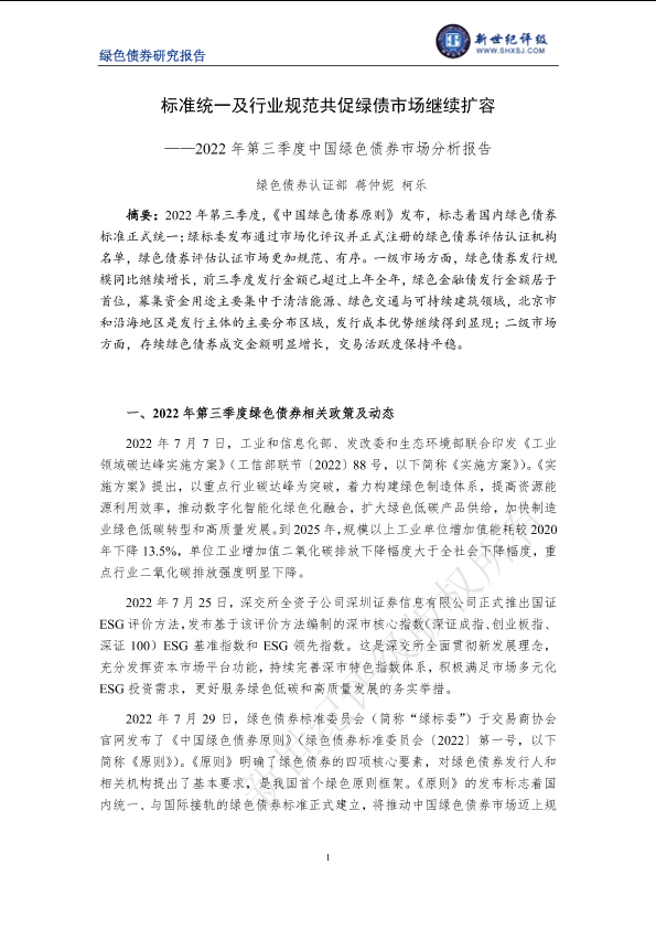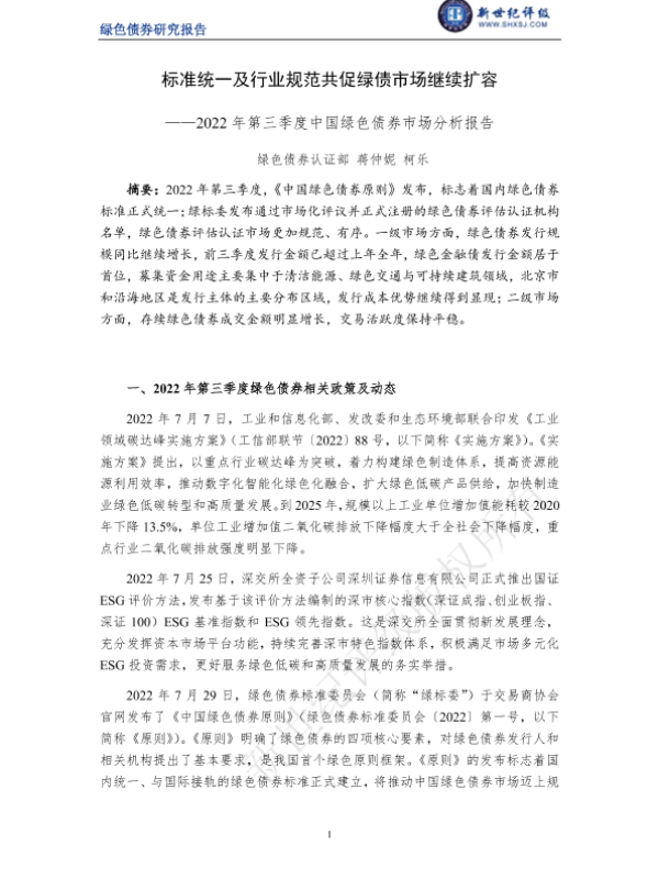 【新世纪评级】【20220930】标准统一及行业规范共促绿债市场继续扩容——2022年第三季度中国绿色债券市场分析报告-13页
