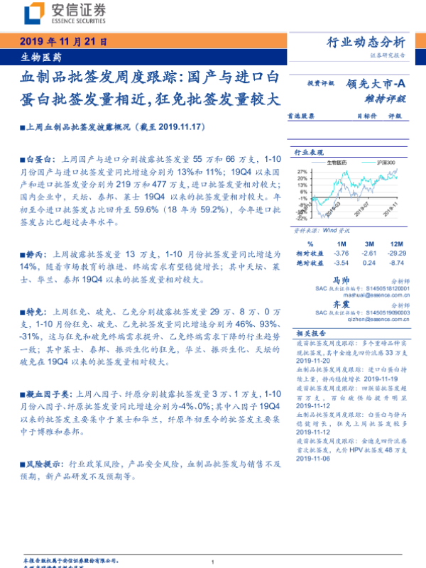 【安信证券】【20191121】血制品批签发周度跟踪:国产与进口白蛋白批签发量相近,狂免批签发量较大-12页