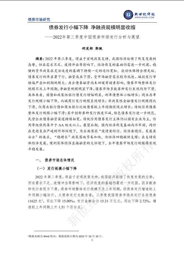 【新世纪评级】【20221010】债券发行小幅下降 净融资规模明显收缩——2022年第三季度中国债券市场发行分析与展望-19页