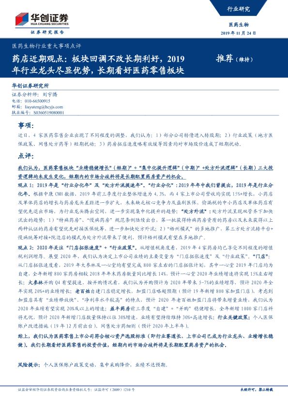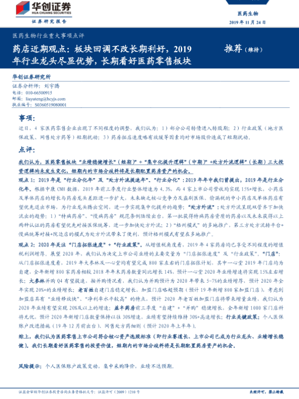 【华创证券】【20191124】药店近期观点:板块回调不改长期利好,2019年行业龙头尽显优势,长期看好医药零售板块-3页