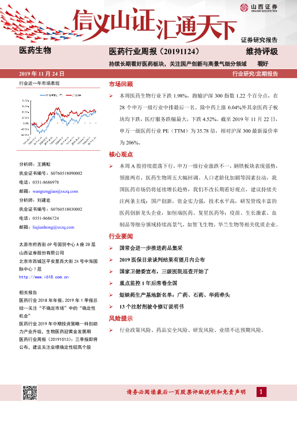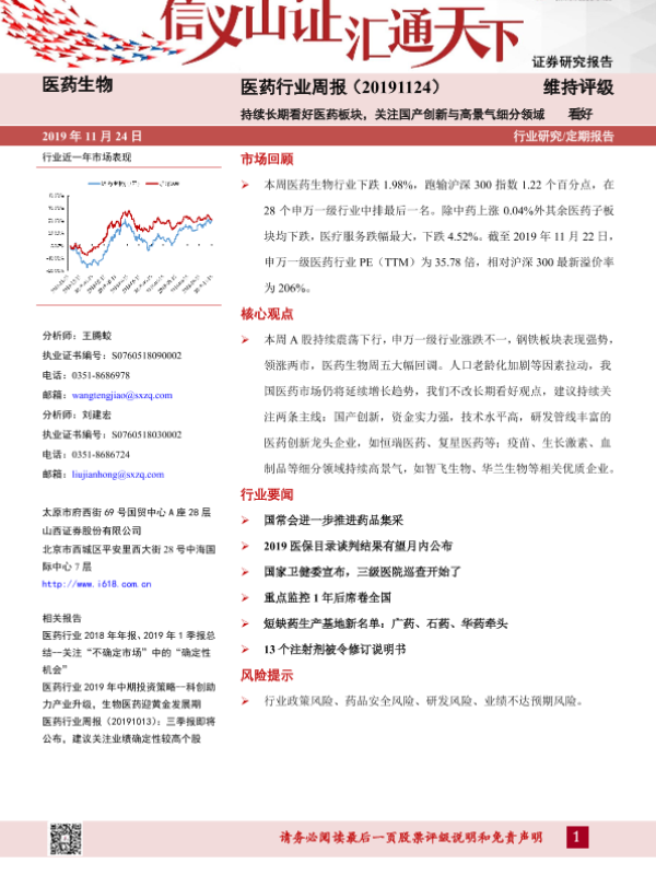 【山西证券】【20191124】医药行业周报:持续长期看好医药板块,关注国产创新与高景气细分领域-8页