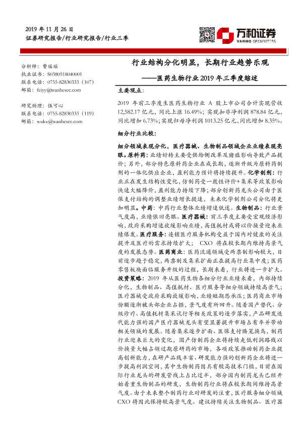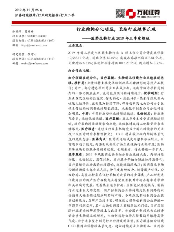 【万和证券】【20191126】医药生物行业2019年三季度综述:行业结构分化明显,长期行业趋势乐观-31页
