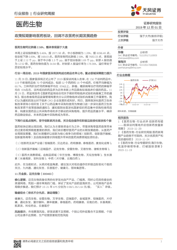 【天风证券】【20191201】医药生物行业研究周报:政策短期影响医药板块,回调不改医药长期发展趋势-12页