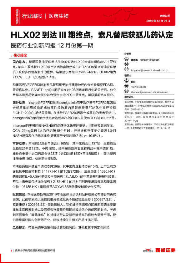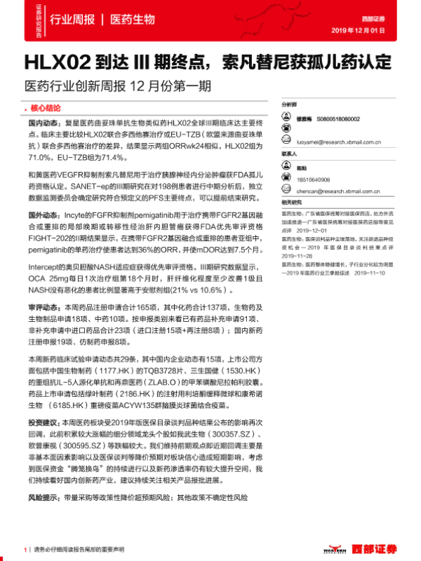 【西部证券】【20191201】医药行业创新周报12月份第一期:HLX02到达III期终点,索凡替尼获孤儿药认定-10页