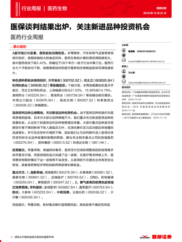 【西部证券】【20191201】医药行业周报:医保谈判结果出炉,关注新进品种投资机会-12页
