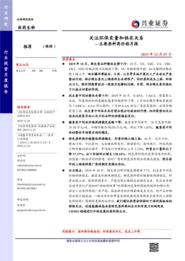 【兴业证券】【20191207】主要原料药价格月报:关注环保变量和供求关系-41页
