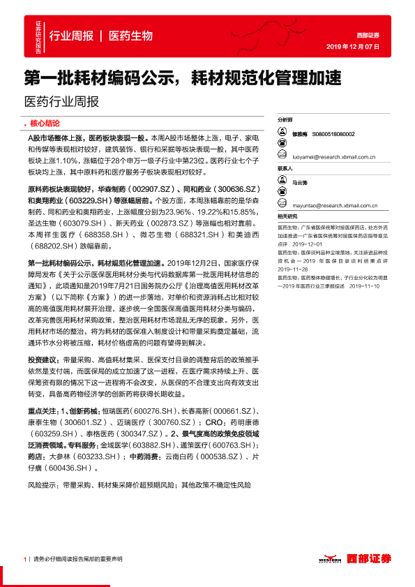 【西部证券】【20191207】医药行业周报:第一批耗材编码公示,耗材规范化管理加速-9页