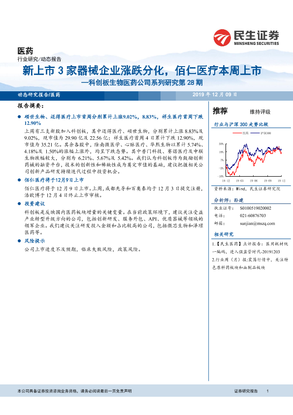 【民生证券】【20191209】新上市3家器械企业涨跌分化,佰仁医疗本周上市-9页