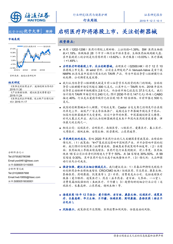 【海通证券】【20191210】医药与健康护理行业周报:启明医疗即将港股上市,关注创新器械-6页