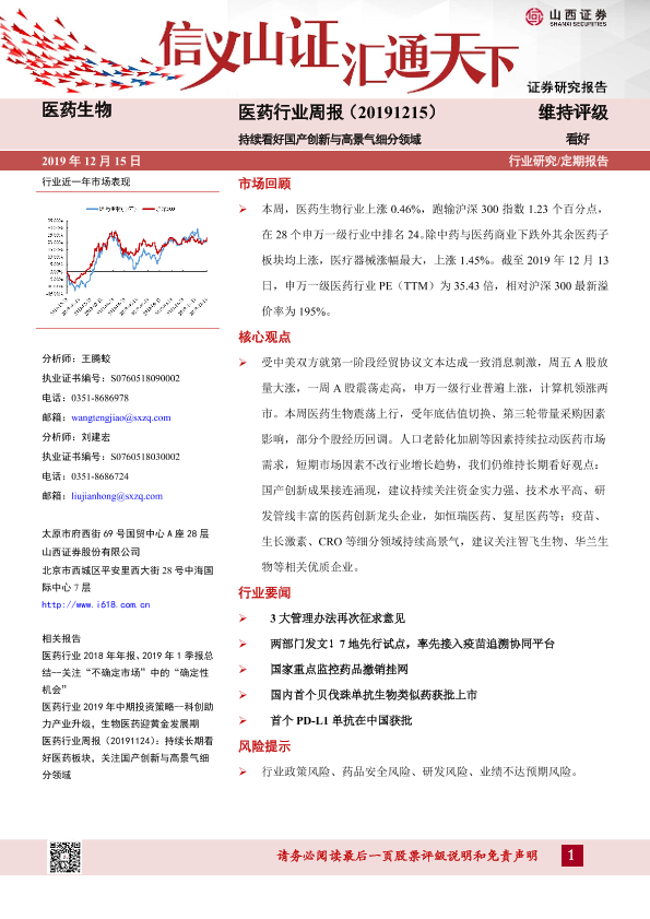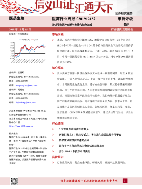【山西证券】【20191215】医药行业周报:持续看好国产创新与高景气细分领域-8页