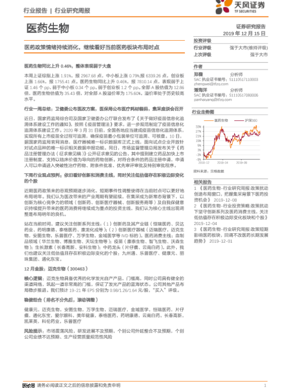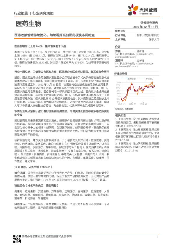 【天风证券】【20191215】医药生物行业研究周报:医药政策情绪持续消化,继续看好当前医药板块布局时点-13页